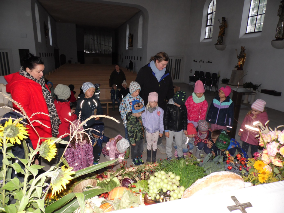 Die Kindergartengruppen des Kinderhauses feierten an allen Standorten wieder das Erntedankfest. Verschiedenste pädagogische Aktionen fanden hierbei statt. Einige Gruppen bauten im Gruppenzimmer einen eigenen kleinen Erntedankaltar auf, manche trafen sich zum gemeinsamen Gebet, wieder andere kochten gemeinsam mit frisch geernteten Lebensmitteln. Fast alle Kinderhaus-Gruppen gingen hoch zur Kirche und besichtigten den ebenso eindrucksvollen wie schönen Erntedankaltar, den Claudia Heisinger zusammen mit freiwilligen Helferinnen errichtet hat. Mit dem Lied „Im Herbst ist Erntezeit“ bedankten sich die Kinder bei Gott für die reichhaltige Ernte, die Jahr für Jahr bei uns erzielt wird und uns nicht hungern lässt.