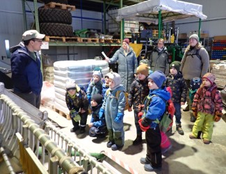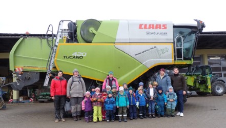 Als Waldgruppe in Bärnzell sind die Rumpelwichte umgeben von Feldern und Wiesen, die von der Saatzucht Steinach bewirtschaftet werden. Bei landwirtschaftlichen Arbeiten sit-zen sie daher sozusagen immer in der ersten Reihe und beobachten vorbeifahrende Tele-skoplader, Erntevollautomaten und vor allem viele Bulldogs bei der Arbeit. Mit großer Neu-gierde, fesselndem Interesse und erstaunlichem Vorwissen verfolgen die Kinder das rege Treiben des Steinacher Betriebs. Jeder kann sich vorstellen, wie aufgeregt die kleinen Rum-pelwichte dann waren, als sie der Einladung zur Firmenerkundung von Jessica Jobst und Julian Broscheit, dem Geschäftsführer, folgten. Die Gruppe durfte sich die verschiedenen Tätigkeitsbereiche der Saatzucht und die dafür erforderlichen Maschinen ganz genau an-sehen. Zunächst besichtigten die Kinder den beeindruckenden Fuhrpark.